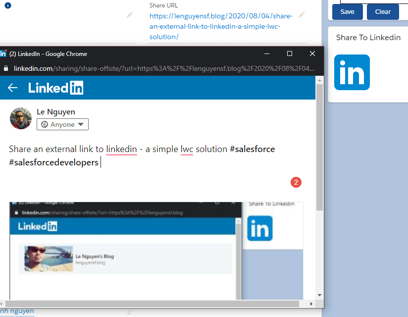 If you have a product record / a training course / a booking link or any record which you have an external like want to share to social media (Facebook, Twitter, LinkedIn), This simple solution perhaps is for you. In this article, we are going to create an LWC which can allow you to share any record to LinkedIn, as soon as the object has a “Share_URL__c” field. Also, you can clone it to create LWCs to share to other platforms.