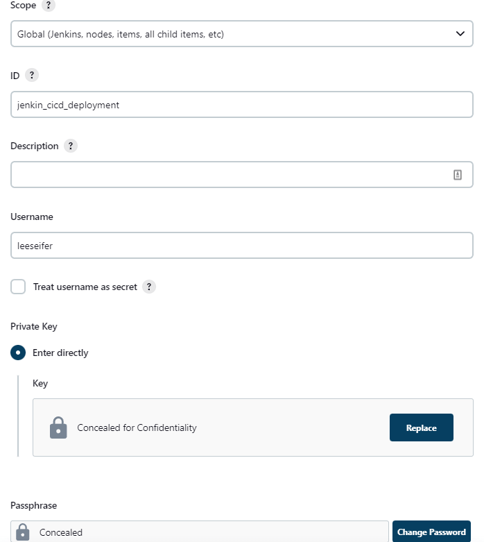 Select Kind SSH Username with the private key. You now just need to fill in all the information. The important information will be ID, Private Key, and Passphrase (If you create an SSH key with one.). The Private Key will be the one without .pub and in format — Begin. Just copy the whole thing into Private Key then save it.