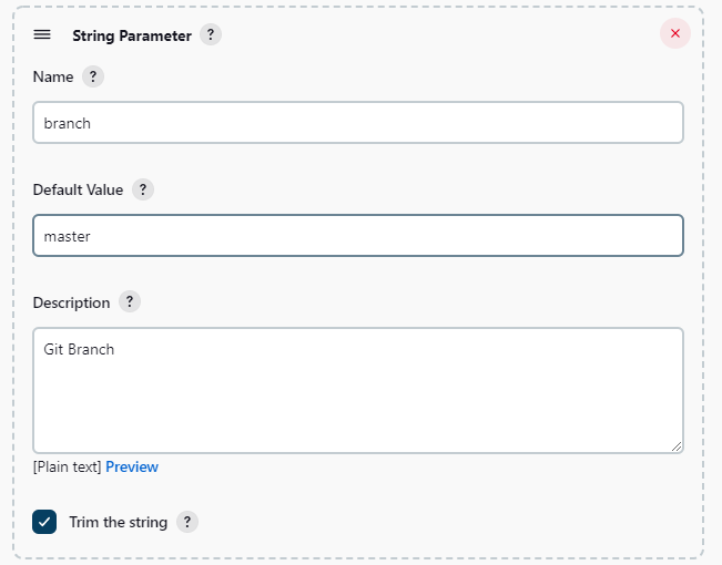 Come back to our Pipeline, we will need to create some parameters; The parameters will be the URL of our repo and the branch of the repo.