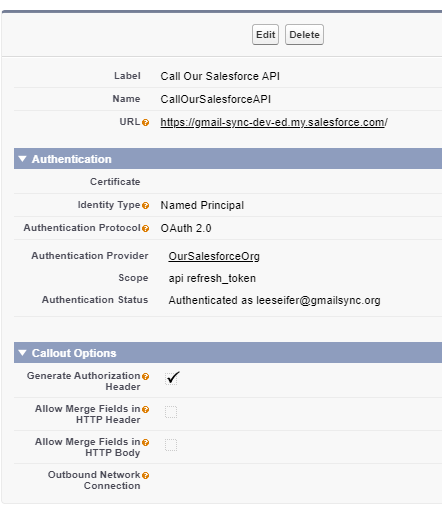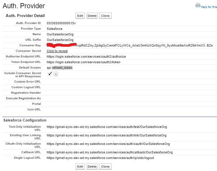 - Authentication Provider: The created Auth. Provider in the previous step (OurSalesforceOrg).