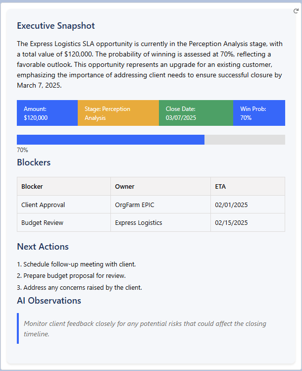 1. Executive Snapshot – 100–120-word paragraph summarising status, value, probability, and sentiment.