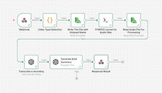 When you feed raw video directly into downstream nodes, you end up troubleshooting issues like “wrong mime type,” “file extension mismatch,” or inconsistent transcription results because the audio properties vary.